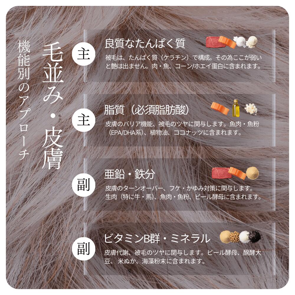 厳選5種の生肉(牛・鶏・馬・豚・魚)、全粒大麦粉、天然魚パウダー、薩摩芋、全粒玄米粉、ココナッツ、オメガ脂肪酸源(菜種・ひまわり由来オイル)、醗酵大豆(プロバイオティクス)、コーンプロテイン、天然酵母、ホエイプロテイン(乳清タンパク)、天然海藻類、ミルクプロテイン(脱脂粉乳由来)、米ぬか醗酵エキス、オリゴ糖(プレバイオティクス)、天然カルシウム、必須アミノ酸類(L-リジン、DL-メチオニン)、天然ハーブエキス(ローズマリーエキス、ユッカエキス)、乳酸菌群(プロバイオティクス)、酵母菌醗酵エキス(バイオジェニックス)、麹菌醗酵エキス(バイオジェニックス)、善玉菌(枯草菌)